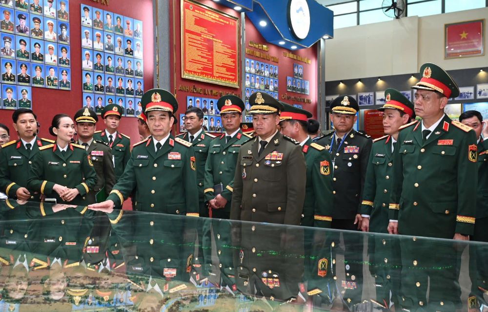 Đại tướng Phan Văn Giang và Đại tướng Tea Seiha cùng các đại biểu hai nước tham quan Nhà truyền thống Sư đoàn 5, Quân khu 7