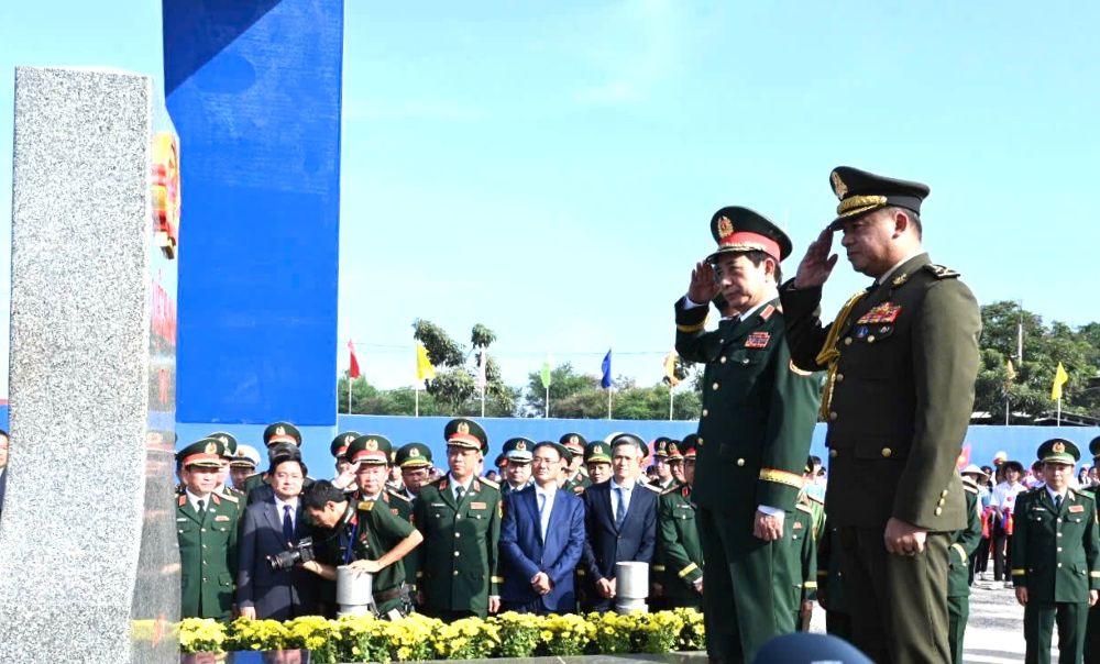 Đại tướng Phan Văn Giang và Đại tướng Tea Seiha thực hiện nghi thức chào cột mốc chủ quyền