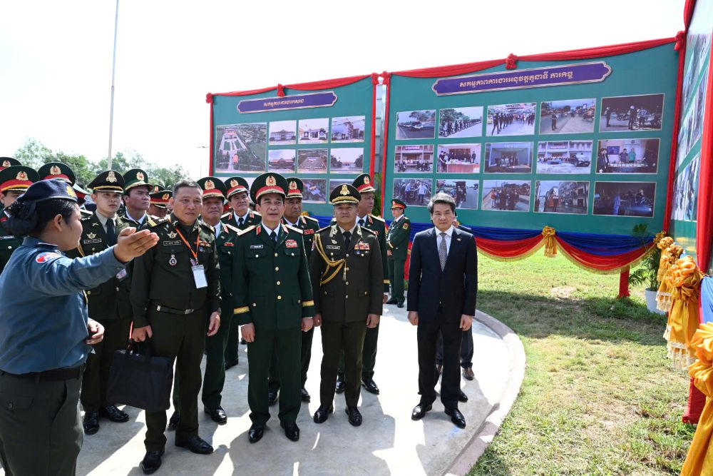 Đại tướng Phan Văn Giang và Đại tướng Tea Seiha cùng các đại biểu nghe giới thiệu về chức năng, nhiệm vụ của Bộ Tư lệnh Hiến binh tỉnh Svay Rieng, Cam-pu-chia