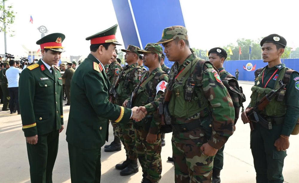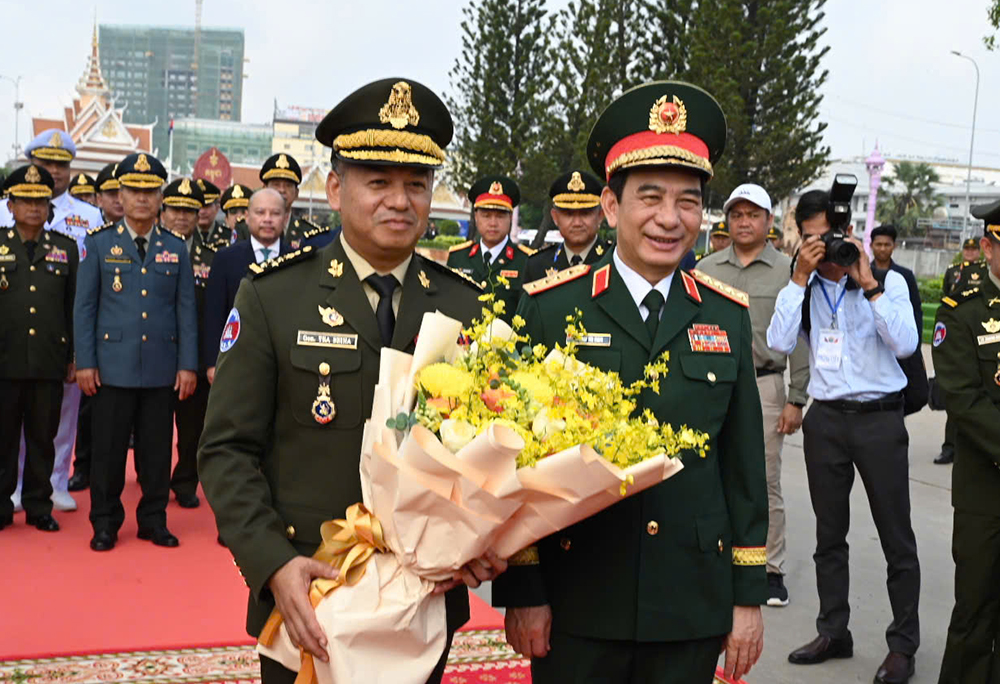 Đại tướng Phan Văn Giang, Ủy viên Bộ Chính trị, Phó Bí thư QUTW, Bộ trưởng Bộ Quốc phòng Việt Nam và Đại tướng Tea Seiha, Phó Thủ tướng, Bộ trưởng Bộ Quốc phòng Cam-pu-chia tại giao lưu