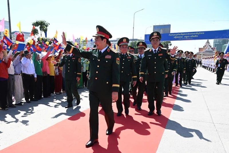 Đại tướng Phan Văn Giang và Đại tướng Tea Seiha duyệt Đội danh dự QĐND Việt Nam