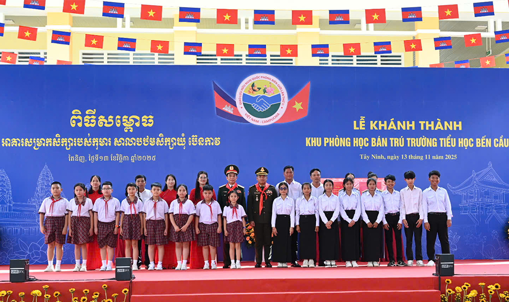 Đại tướng Phan Văn Giang và Đại tướng Tea Seiha chụp ảnh chung với các thầy, cô giáo và các em học sinh hai bên biên giới tại Trường Tiểu học Bến Cầu, tỉnh Tây Ninh, Việt Nam