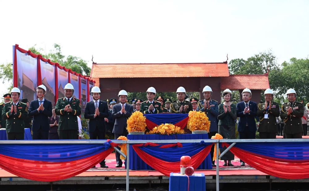 Đại tướng Phan Văn Giang và Đại tướng Tea Seiha cùng các đại biểu thực hiện nghi thức động thổ xây dựng công trình hữu nghị Trường Tiểu học Sang Sovan, tỉnh Svay Rieng, Cam-pu-chia