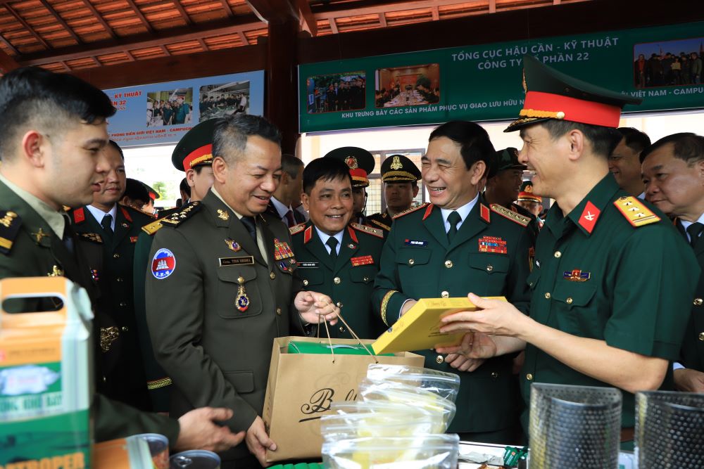 Đại tướng Phan Văn Giang và Đại tướng Tea Seiha cùng các đại biểu hai nước tham quan khu trưng bày giới thiệu các sản phẩm tiêu biểu của ngành Hậu cần - Kỹ thuật QĐNDViệt Nam