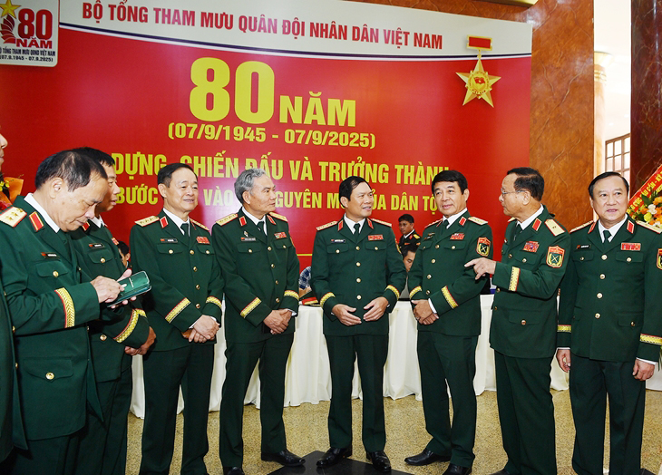 Đại tướng Nguyễn Tân Cương trò chuyện thân mật với các đại biểu tham dự Lễ kỷ niệm 80 năm Ngày truyền thống BTTM QĐND Việt Nam (07/9/1945 - 07/9/2025) và đón nhận danh hiệu Anh hùng Lực lượng vũ trang nhân dân, tháng 9/2025.