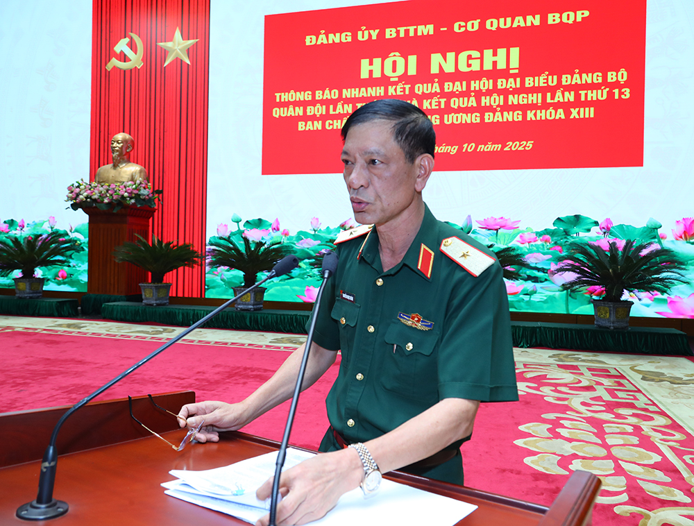 (Bqp.vn) - Chiều 17/10, tại Hà Nội, Đảng ủy Bộ Tổng Tham mưu (BTTM) - Cơ quan Bộ Quốc phòng tổ chức Hội nghị thông báo nhanh kết quả Đại hội đại biểu Đảng bộ Quân đội lần thứ XII và kết quả Hội nghị lần thứ 13 Ban Chấp hành Trung ương Đảng khóa XIII. Thượng tướng Phùng Sĩ Tấn, Phó Tổng Tham mưu trưởng QĐND Việt Nam, Bí thư Đảng ủy BTTM - Cơ quan Bộ Quốc phòng chủ trì hội nghị.