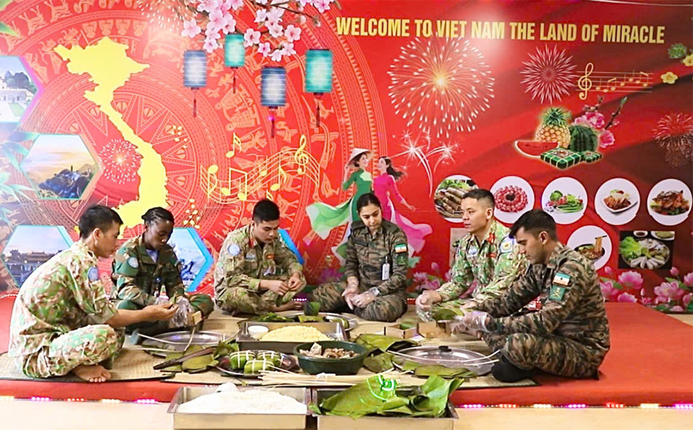 Lực lượng gìn giữ hòa bình Việt Nam tại Abyei cùng các đồng nghiệp quốc tế tham gia gói bánh Chưng trong dịp Tết Nguyên đán Bính Ngọ 2026.