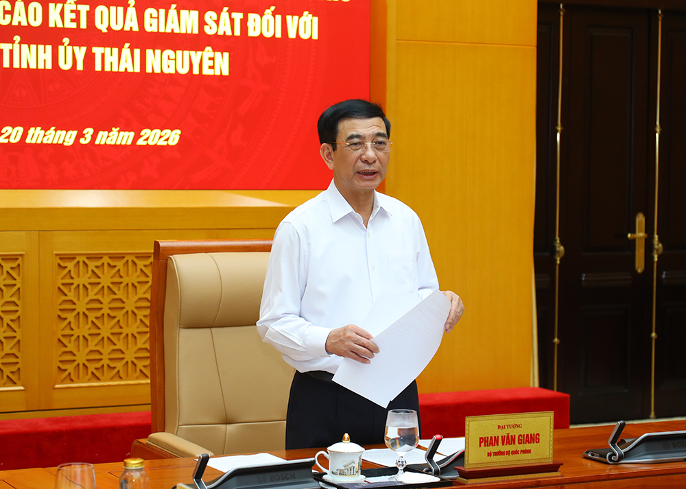(Bqp.vn) - Chiều 20/3, tại Hà Nội, Đại tướng Phan Văn Giang, Ủy viên Bộ Chính trị, Phó Bí thư Quân ủy Trung ương, Bộ trưởng Bộ Quốc phòng đã chủ trì Hội nghị Đoàn kiểm tra, giám sát số 16 của Bộ Chính trị, Ban Bí thư thông qua dự thảo Báo cáo kết quả giám sát đối với Ban Thường vụ Tỉnh ủy Thái Nguyên.