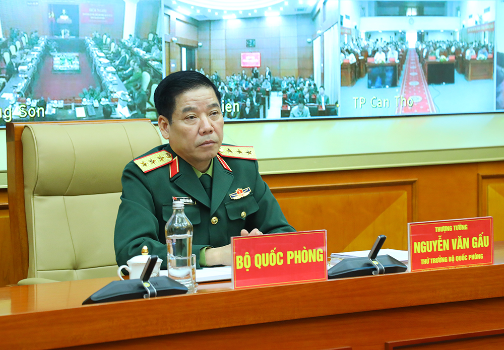 Thượng tướng Nguyễn Văn Gấu, Ủy viên Trung ương Đảng, Thứ trưởng Bộ Quốc phòng chủ trì hội nghị tại điểm cầu Sở Chỉ huy Bộ Quốc phòng.