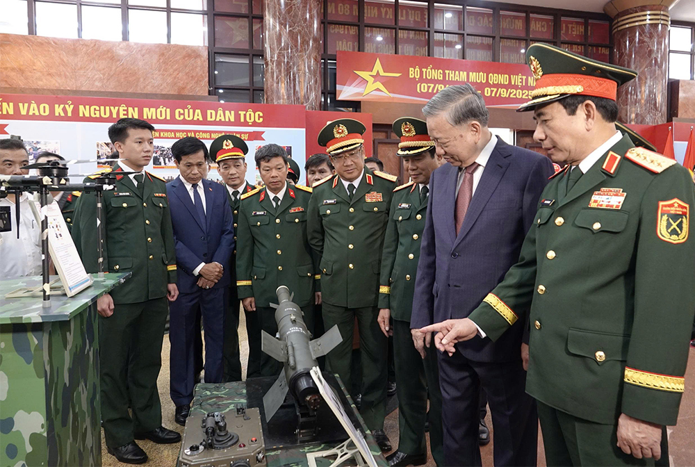 Tổng Bí thư Tô Lâm, Bí thư Quân ủy Trung ương cùng các đại biểu tham quan khu trưng bày tại Lễ kỷ niệm 80 năm Ngày truyền thống Bộ Tổng Tham mưu QĐND Việt Nam (07/9/1945 - 7/9/2025) và đón nhận danh hiệu Anh hùng Lực lượng vũ trang nhân dân, tháng 9/2025.
