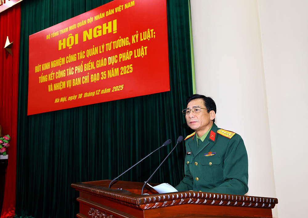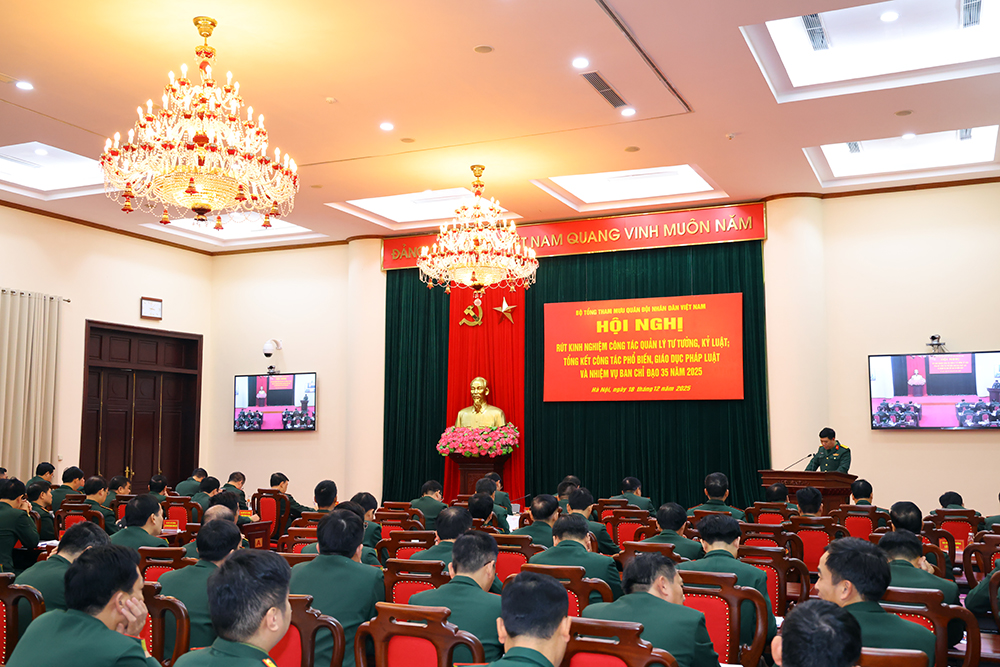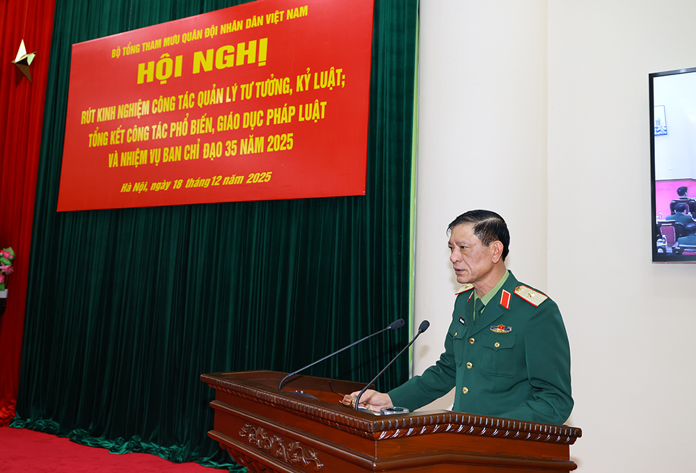 (Bqp.vn) - Chiều 18/12, tại Hà Nội, Bộ Tổng Tham mưu QĐND Việt Nam tổ chức Hội nghị rút kinh nghiệm công tác quản lý tư tưởng, kỷ luật; tổng kết công tác phổ biến, giáo dục pháp luật và nhiệm vụ Ban Chỉ đạo 35 năm 2025. Thiếu tướng Nguyễn Ngọc Đoàn, Phó Bí thư Đảng ủy BTTM - Cơ quan Bộ Quốc phòng, Chủ nhiệm Chính trị BTTM chủ trì hội nghị.