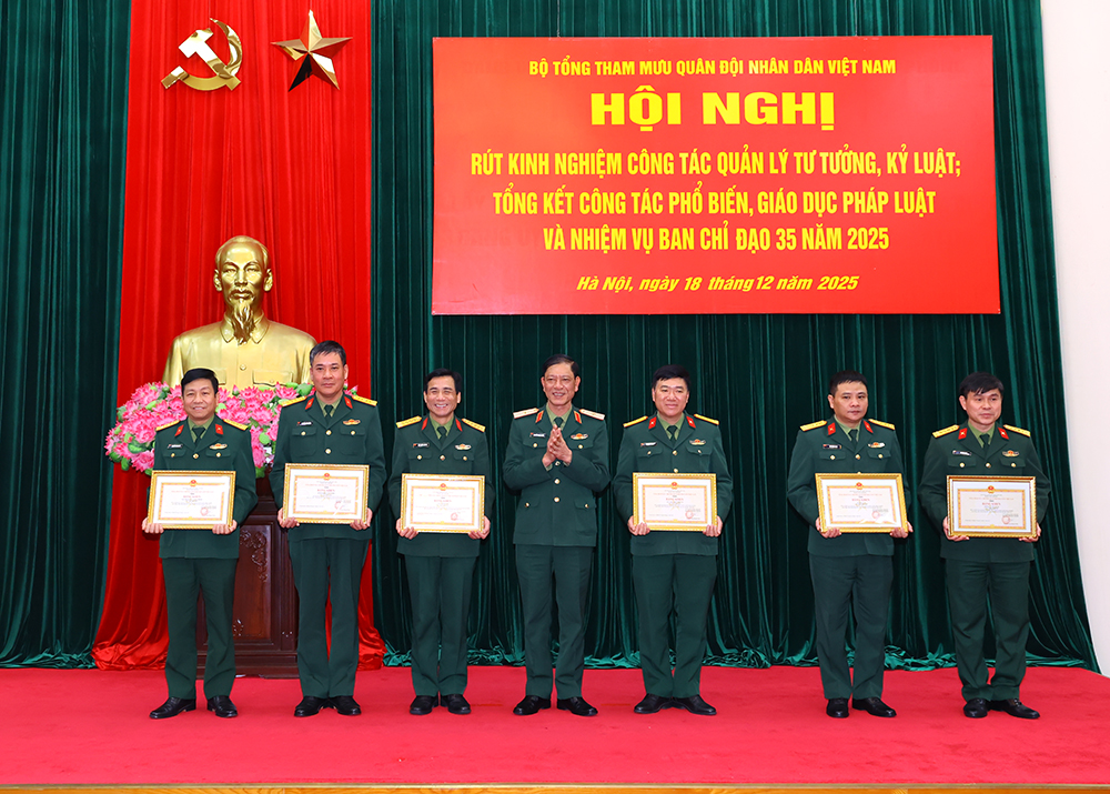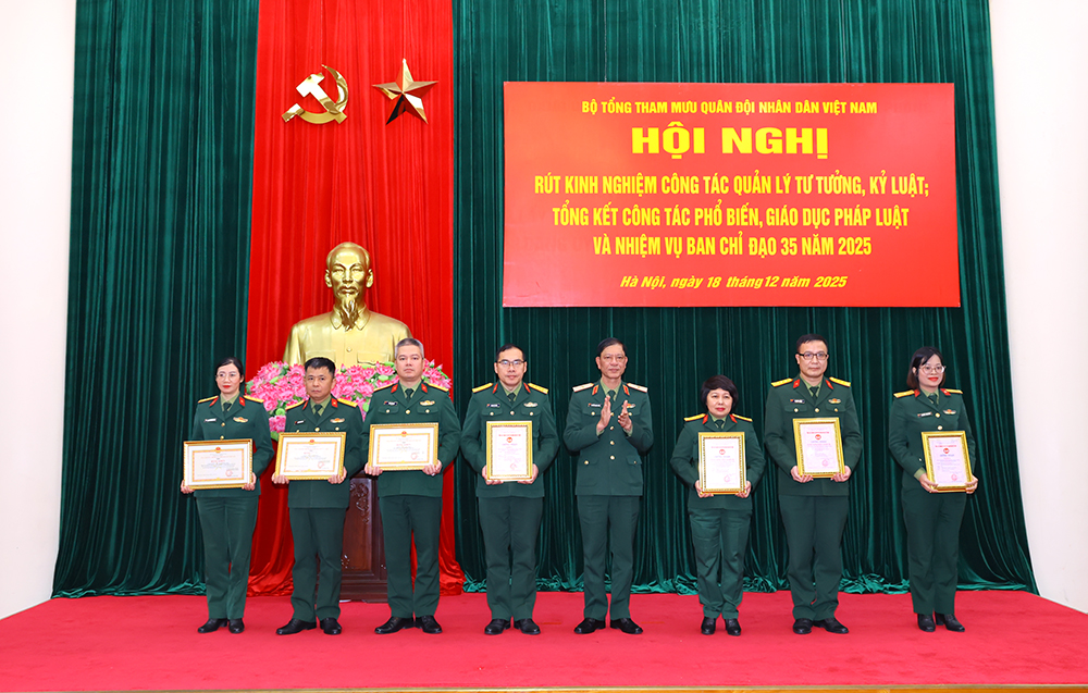 Tại hội nghị, Ban Tổ chức đã công bố quyết định và trao thưởng cho các tập thể, cá nhân đạt thành tích xuất sắc trong thực hiện nhiệm vụ bảo vệ nền tảng tư tưởng của Đảng, đấu tranh phản bác các quan điểm sai trái thù địch và đạt giải Cuộc thi Chính luận về bảo vệ nền tảng tư tưởng của Đảng lần thứ 5 cấp toàn quân năm 2025.