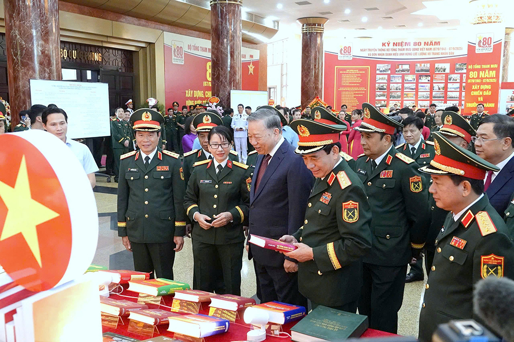 Tổng Bí thư Tô Lâm và các đại biểu tham quan khu trưng bày tại lễ kỷ niệm 80 năm ngày truyền thống Bộ Tổng Tham mưu QĐND Việt Nam (07/9/1945 - 07/9/2025) và đón nhận danh hiệu Anh hùng LLVT nhân dân, tháng 9/2025.