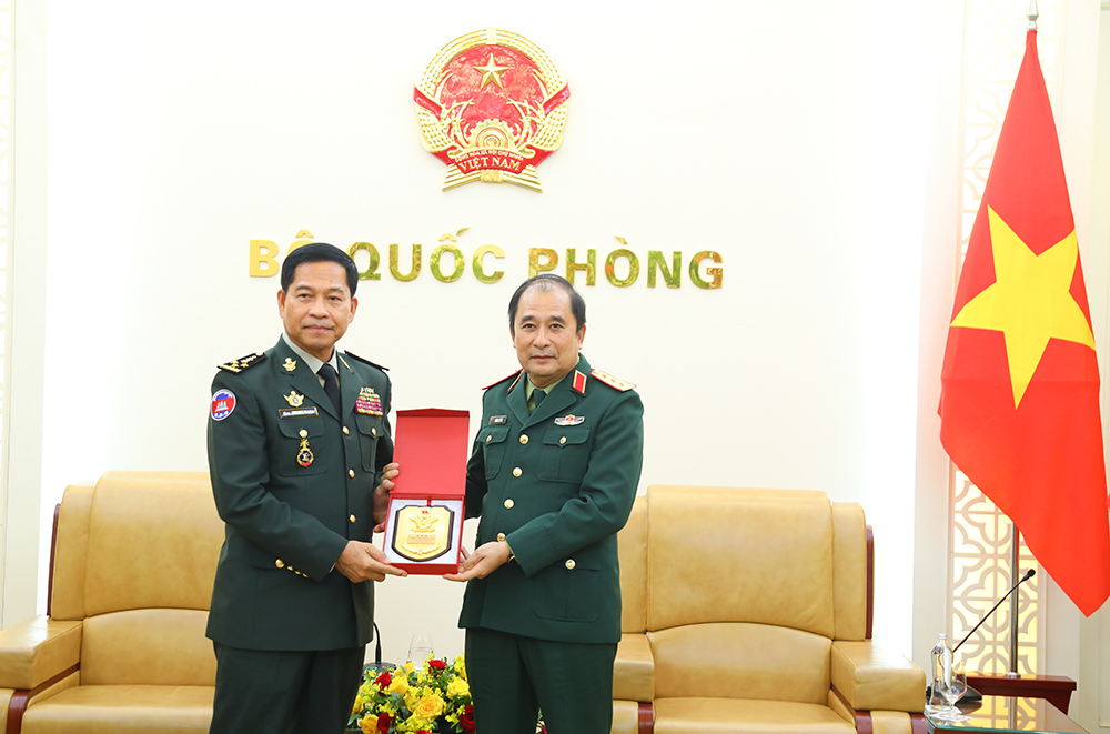 Thượng tướng Phùng Sĩ Tấn trao quà lưu niệm tặng Đại tướng Phorn Nara.