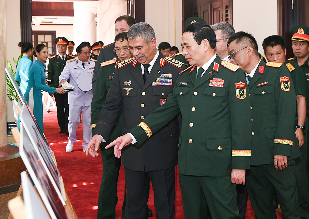 Đại tướng Phan Văn Giang và Thượng tướng Zakir Hasanov cùng các đại biểu tham quan khu trưng bày ảnh về quan hệ hợp tác giữa hai nước.