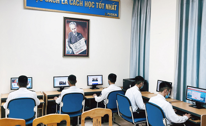 Thí sinh là chiến sĩ nghĩa vụ tham gia tham gia vòng thi thử Cuộc thi trực tuyến “Tìm hiểu Luật Cảnh sát biển Việt Nam” tại Thư viện của đơn vị.